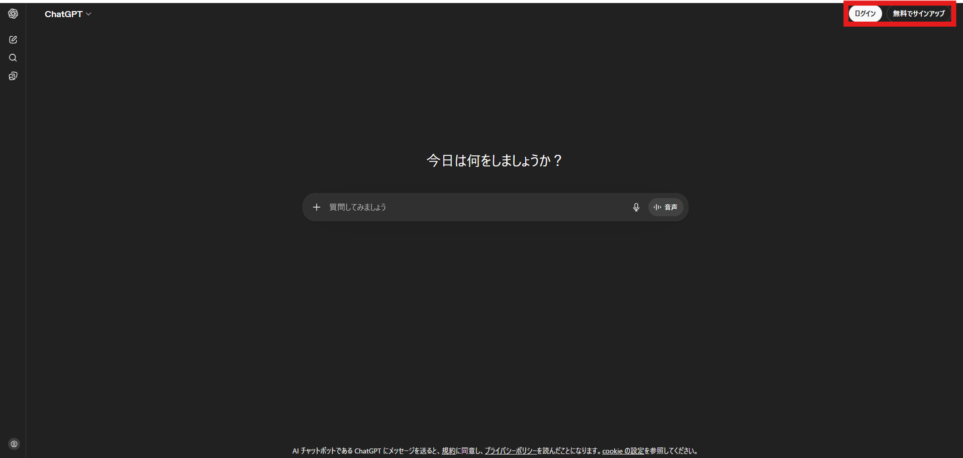 最初にChatGPTへログインします。すでにログイン済みの場合は、そのまま次へ進んでください。初回設定は原則1回で完了します。